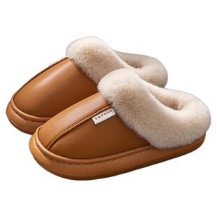 男士棉拖鞋家居室内冬季PU皮面防水厚底防滑加绒保暖毛绒拖鞋男款